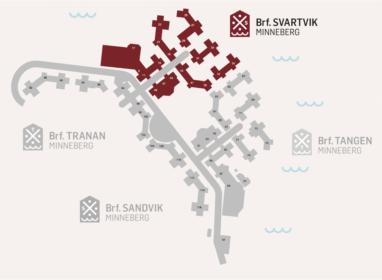 Under den här menyn finns allmän information om Brf Svartvik, en av fyra bostadsrättsföreningar som ingår i Minnebergs samfällighet, varav Brf Svartvik är den största med 327 lägenheter. Kartan nedan visar föreningens placering i Minneberg.