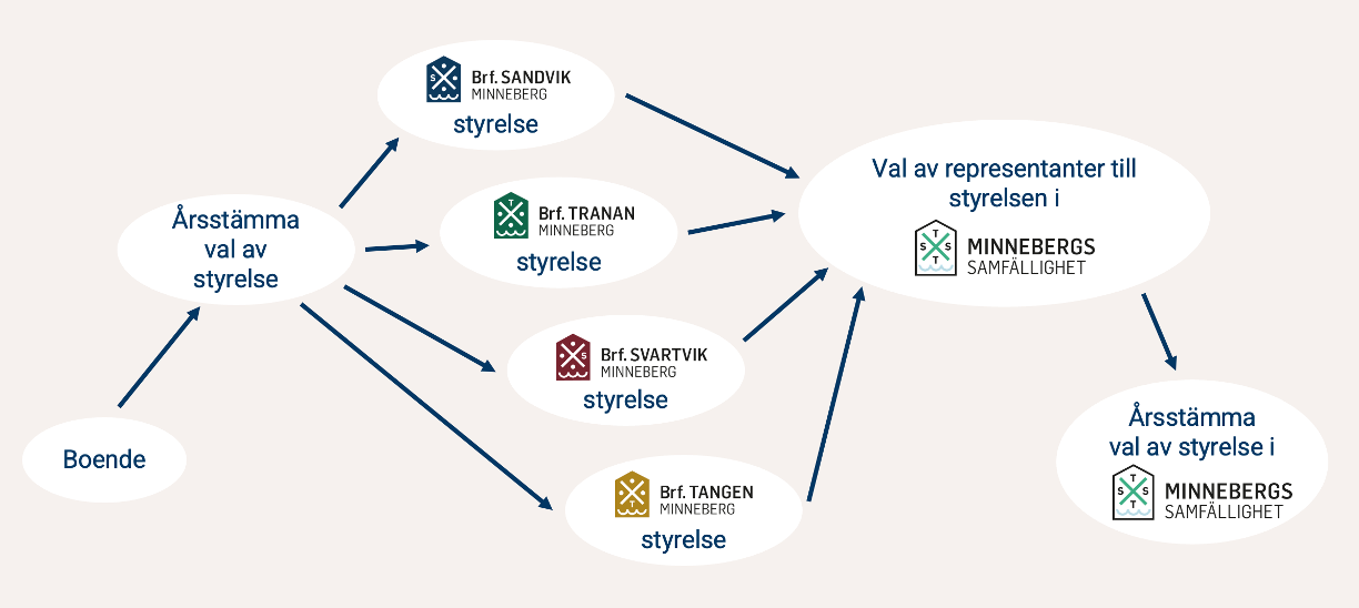 Fyra bostadsrättsföreningar ingår i Minnebergs samfällighet. Brf Sandvik, Brf Svartvik, Brf Tangen och Brf Tranan och så Minnebergs samfällighetsförening. Hur hänger de ihop? Och vem gör egentligen vad?